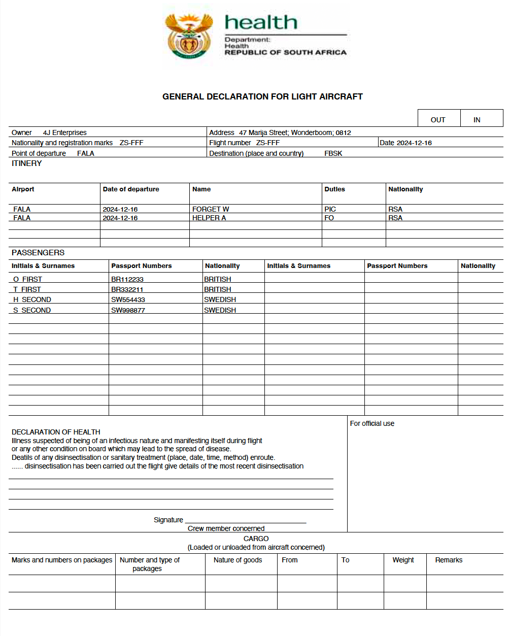 xborder.co.za is a page that generates all necessary cross border documents for flights conduted into and out of South Africa. Build crew lists and recurring passenger details to create the required documents in minutes. Subscription is free at the moment.