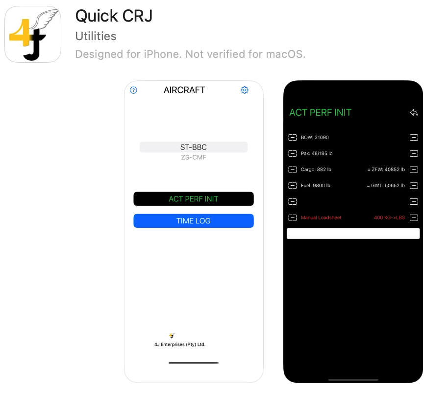 Quick CRJ is an iPhone app that allows for W&B and loadsheet calculations for CRJ100 & 200 type aircraft. A second module allows for the capure of hours from block-block and flight time calculation.